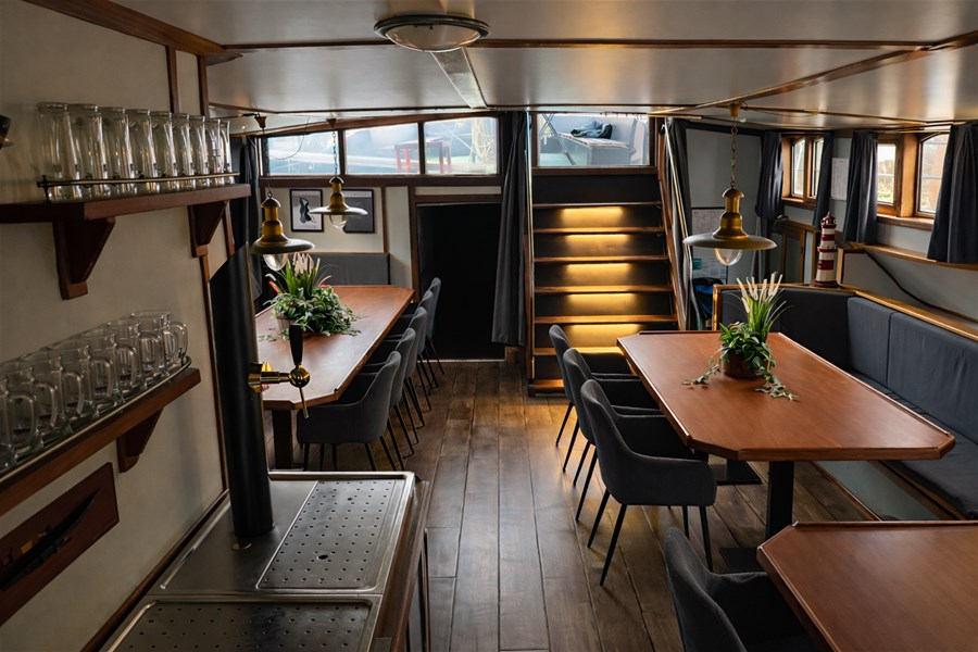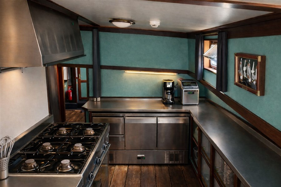 Auch der behagliche Aufenthaltsraum des Klippers Alliantie lädt zum gemeinsamen Verweilen ein. Die Einrichtung aus Holz und die stilvollen Kupferlampen verführen geradezu zu langen, gemütlichen Abenden an Bord. In der Bordküche können Sie für die ganze Gruppe ein leckeres Essen zubereiten.
